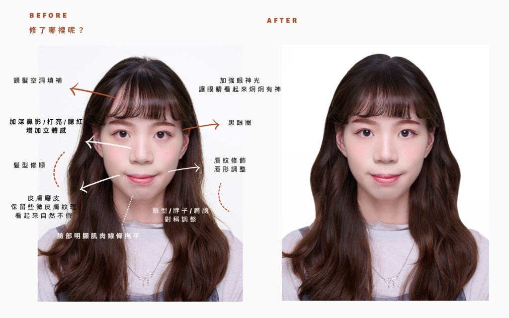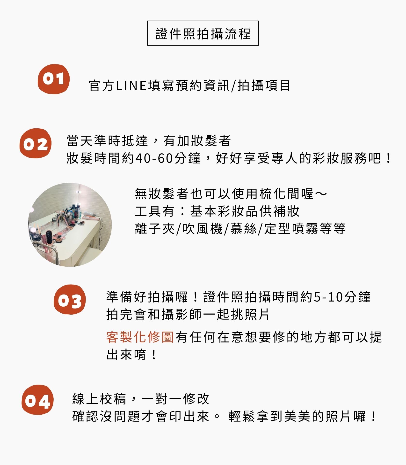 #妝髮服務需提前預約 *妝髮內容 : 基本證件照妝容可依個人習慣與造型師溝通。